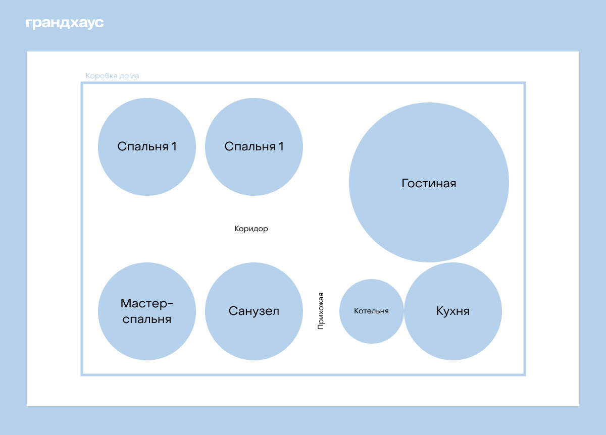 Внутри коробки располагаем комнаты. Можно сначала обозначить все помещения примерно — кружками.