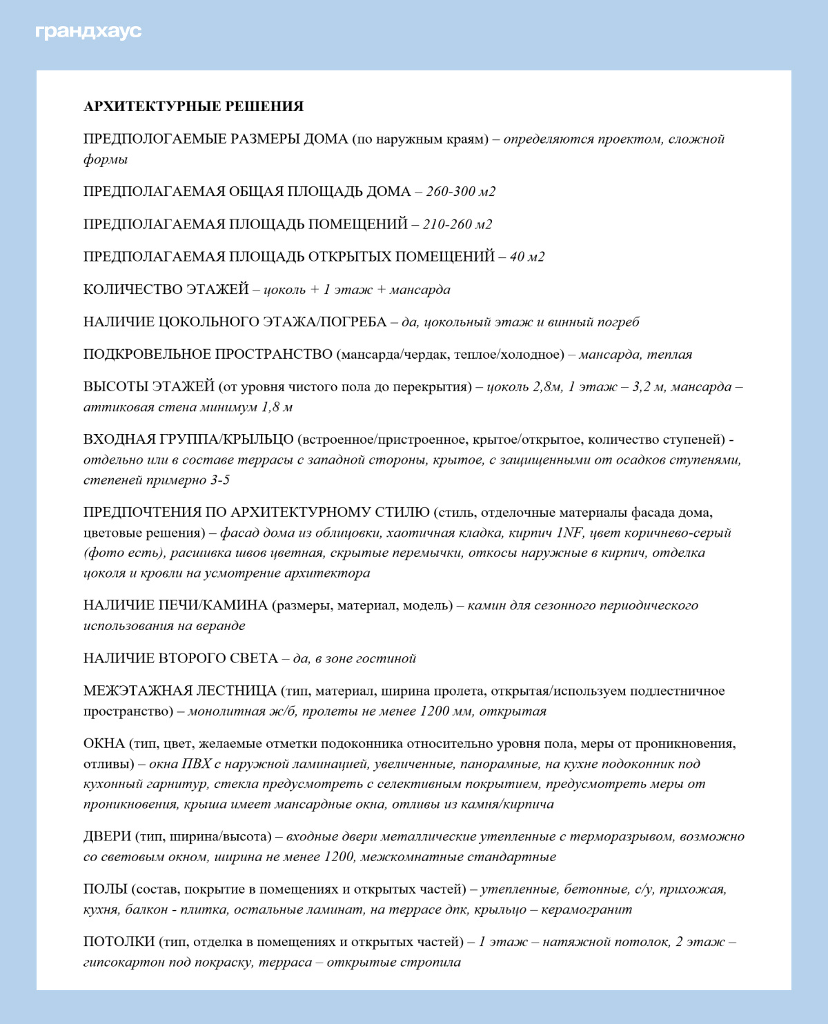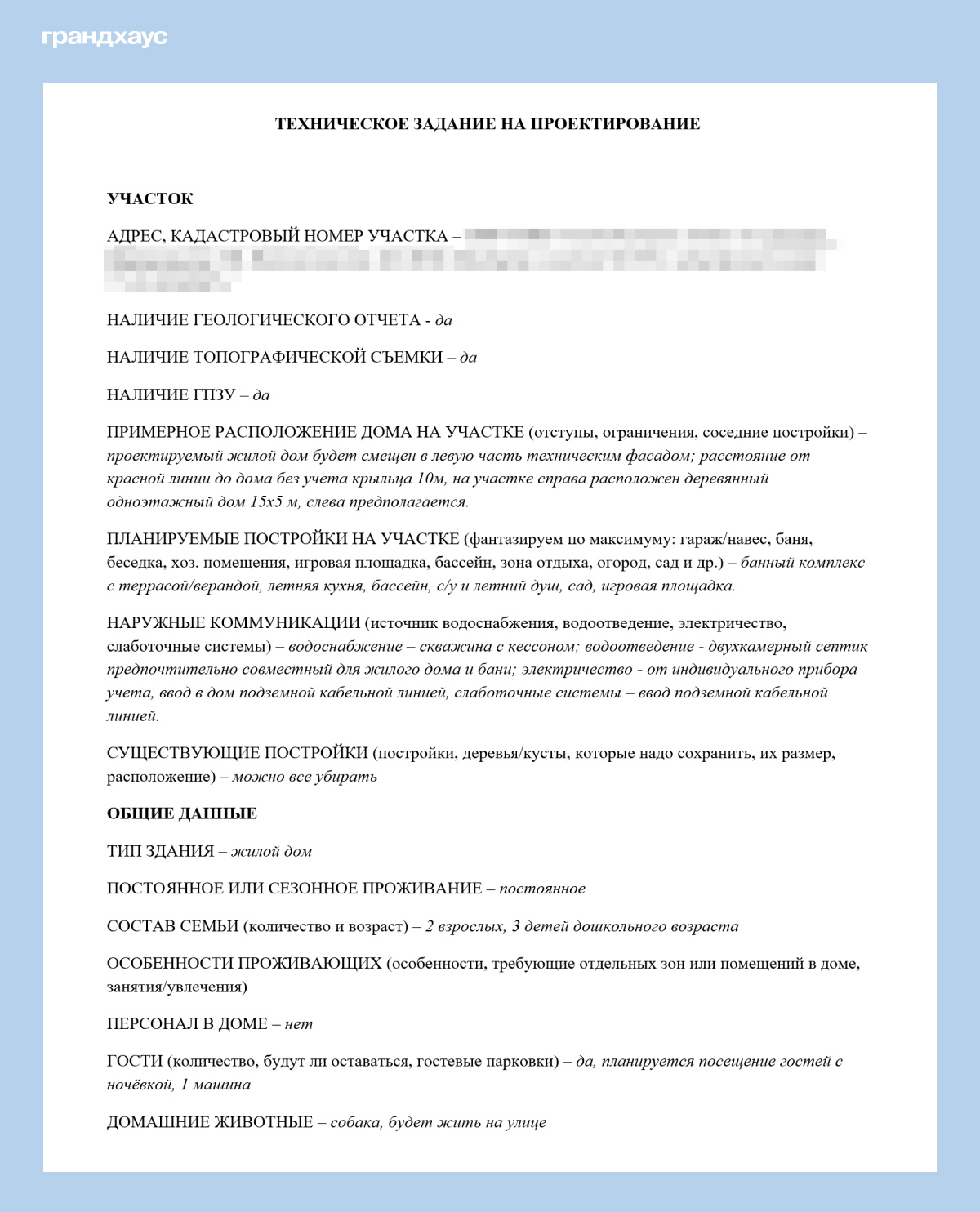 Техническое задание на проектирование по опроснику Грандхауса. Заполнено нашими реальными клиентами (при консультации с менеджером). Общие данные