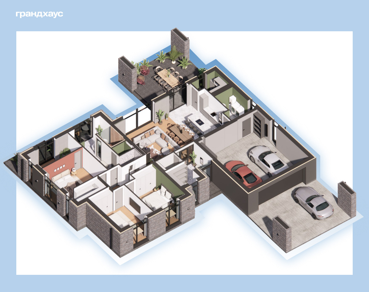 Удобства для домашних животных мы предусматриваем и в своих серийных проектах. На визуализации — вариант планировки проекта «Грандхаус Лето»