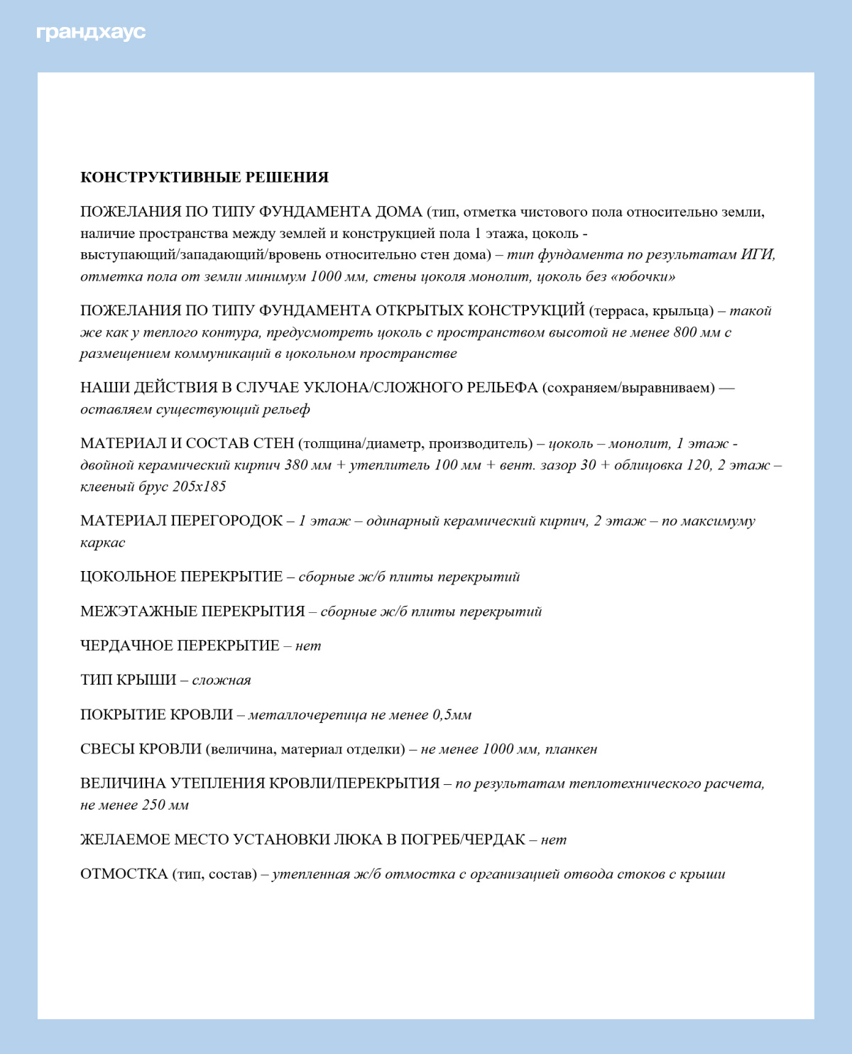 Техническое задание на проектирование, подготовленное клиентами по нашему опроснику. Конструктивные решения