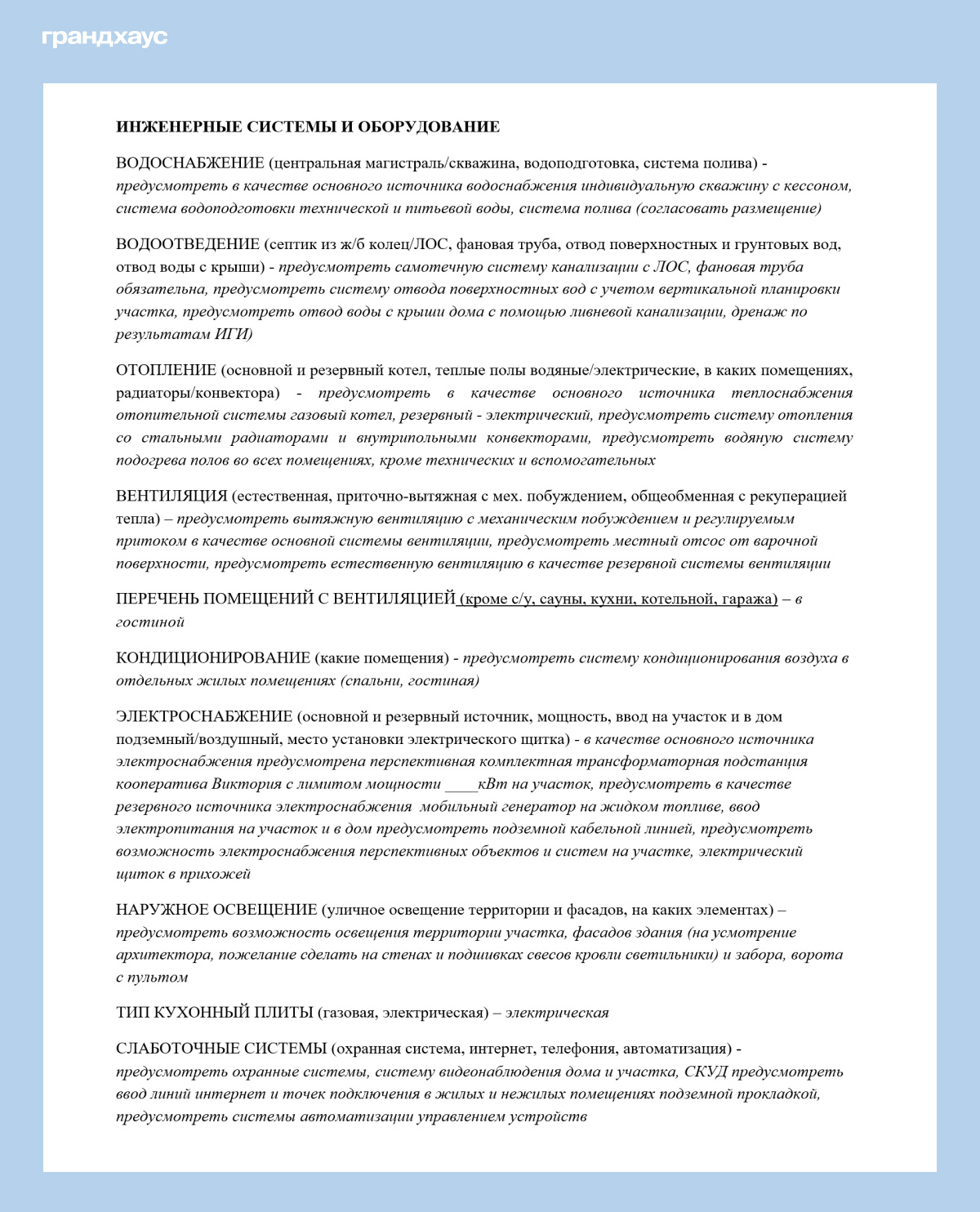 Техническое задание на проектирование, подготовленное клиентами по нашему опроснику. Инженерные системы