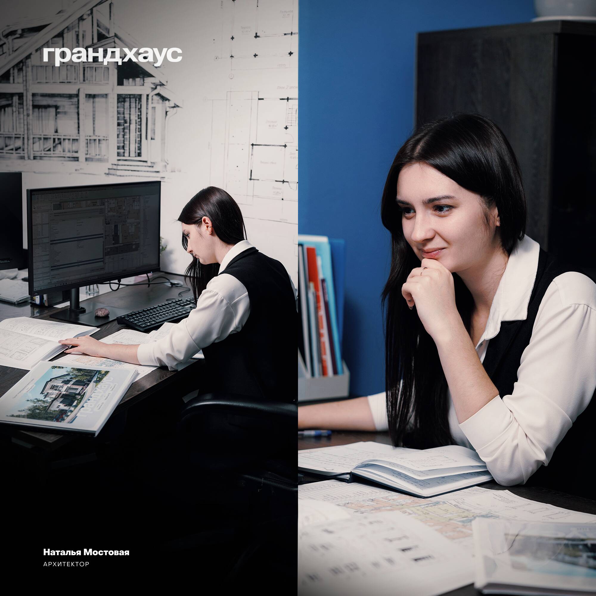 Знакомьтесь! Наталья Мостовая, архитектор Грандхауса. Помимо частных домов, на ее счету проекты многоэтажных комплексов и средневековых замков. Критикует советскую архитектуру, но некоторые заветы Ленина чтит. В работе вдохновляется природой и книгами, а трудиться предпочитает под музыку.
