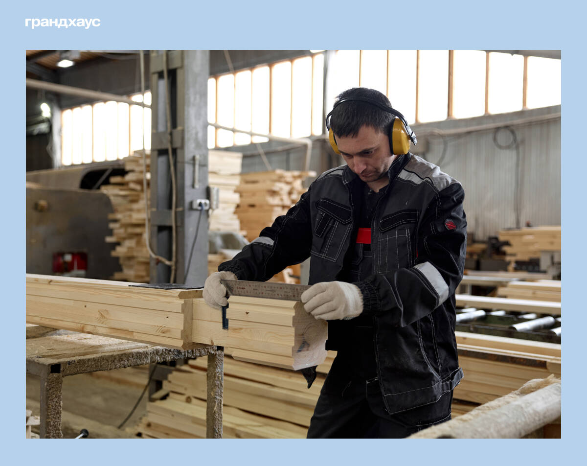 Производство Грандхауса в Кировской области. На фото: проверяем геометрию клееного бруса