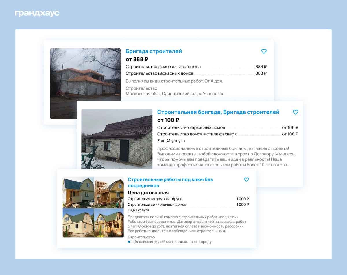 В самом начале нашей деятельности, когда у Грандхауса еще не сформировался список бригад, с которыми мы сотрудничаем постоянно, мы нередко сталкивались с вопиющим непрофессионализмом и безответственностью исполнителей. А у вас вряд ли будет возможность давать тестовые задания и анализировать результат.
