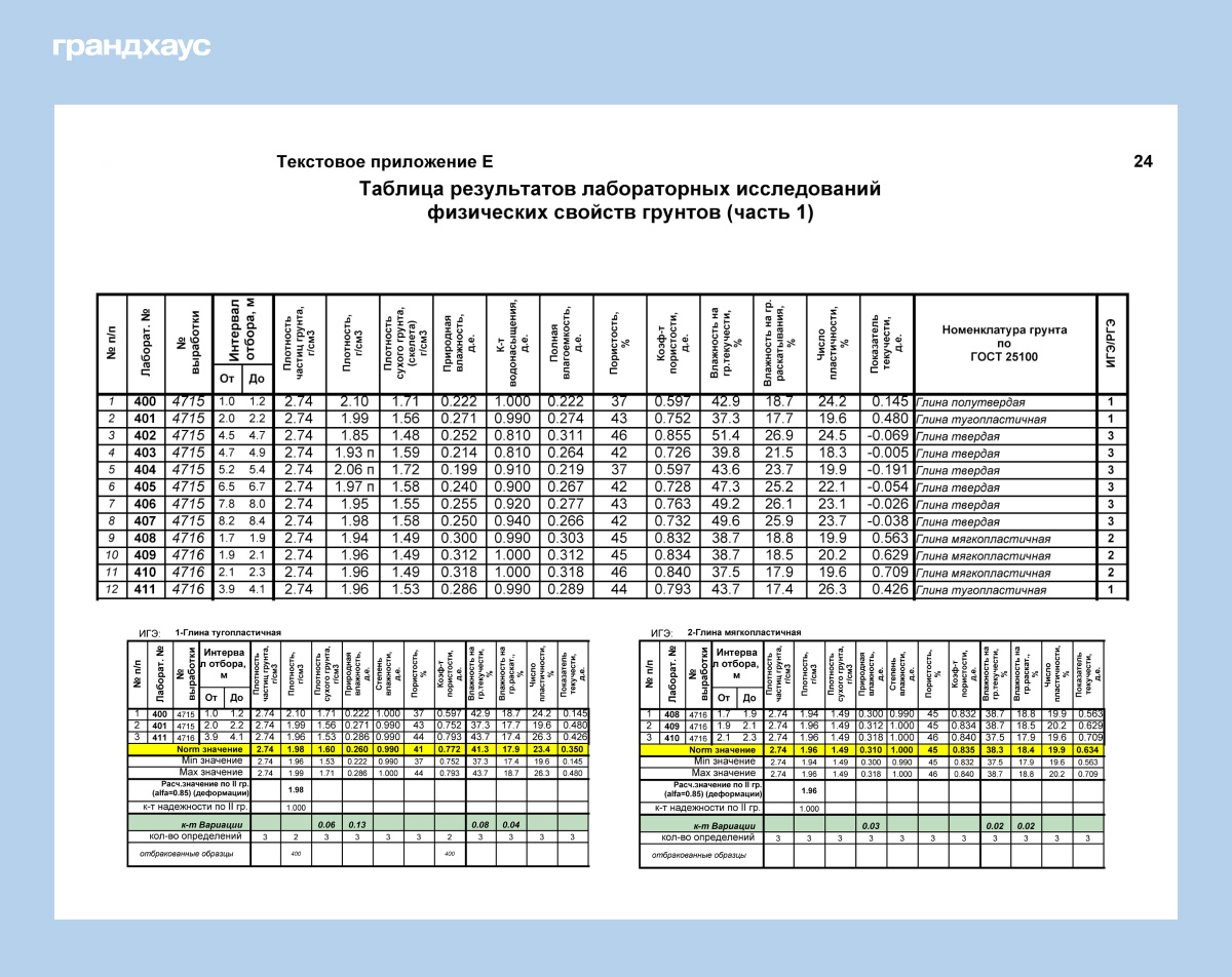 В лаборатории для вас составят отчет о результатах геологических изысканий. Для крупных объектов может получиться целая книга листов на 70. В отчëте будут физико-механические свойства грунтов, инженерно-геологические разрезы, иллюстрирующие состав грунта, результаты химического анализа воды и т.п.